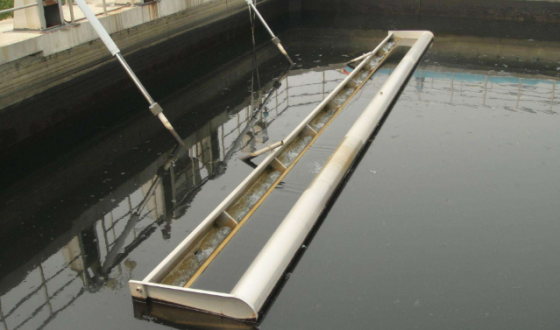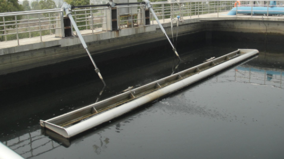 在曝气和沉淀阶段,滗水器位于主曝气区的最高液位之上。滗水时,下降到水面以下进行排水,当水位下降到最低水位,滗水器返回到初始位置。