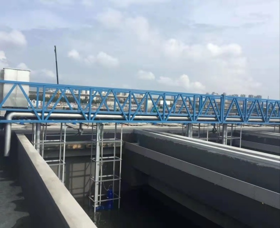 5、主梁结构合理,对于大跨度平流沉淀池吸泥机采用桁架式或“L”型组合梁;中、小跨度的斜管池吸泥机采用单或双管式梁、型钢梁;特别是斜管沉淀池水中吸输泥管既为通道又作承载构件,因而用料省且制造维护方便。