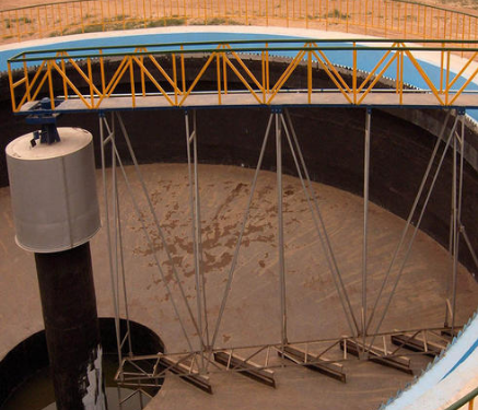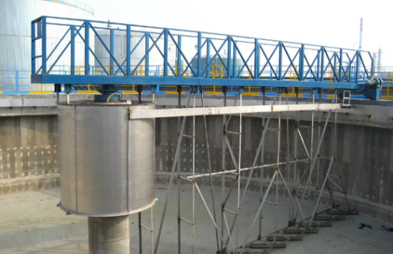 主梁由置于周边的驱动装置带动,绕池中心轴线旋转,沉积在池底的污泥由刮泥板刮集至各吸泥口,在液位差的作用下,污泥经吸泥口,输泥槽、虹吸管、中心泥罐、中心排泥管排至污泥坑。每个吸泥管上端设有调节器,以调节各吸泥管的流量分配。同时,液面上的浮渣向随主梁旋转的撇渣板和周边浮渣挡板形成的渐缩区域内集中,至其封闭边—刮渣摆臂。当摆臂抵达集渣斗时,由摆臂上的刮渣板刮至集泥斗。