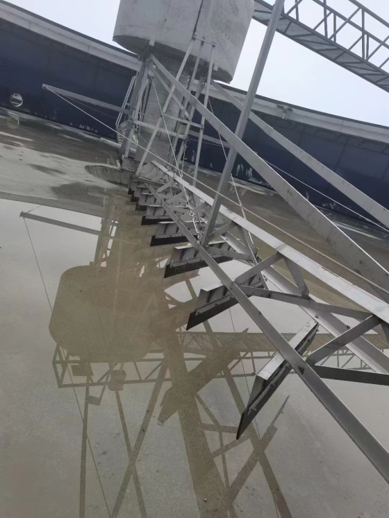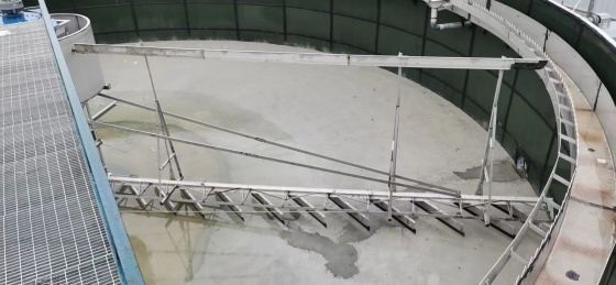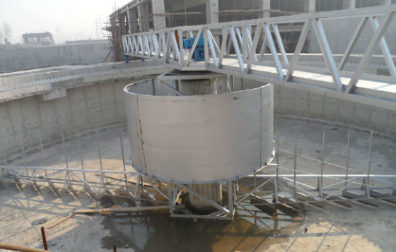 固定在旋转立架上的刮板臂在驱动装置的带动下绕水池中心轴旋转,沉积在水池底部的污泥被刮板刮取收集到水池中心的集泥坑中。除渣器和外围浮渣挡板集中在与导流缸一起旋转的除渣器直到其封闭边缘形成的锥形区域-刮渣摆臂。当摆臂到达集渣斗时,摆臂上的刮渣器将其刮向集渣斗,并将其从池中排出。