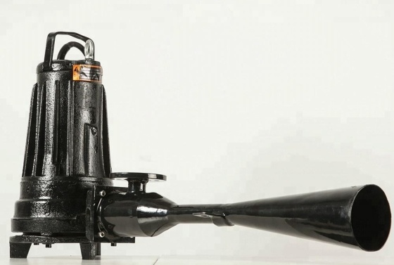 通过潜水泵产生的水流经过喷嘴形成高速水流,在喷嘴周围形成负压吸入空气,经混合室与水流混合,在喇叭形的扩散管内产生水气混合流,高速喷射而出,夹带许多气泡的水流在较大面积和深度的水域内涡旋搅拌,完成曝气,并且其轴功率不随潜没深度的变化而变化,进气量可以调节。正因为如此,射流式曝气机可以在水位变化较大的池中应用。